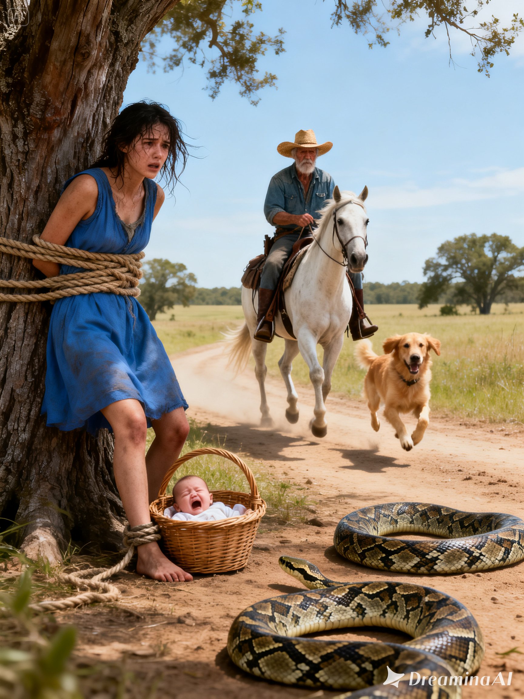 Two enormous boas slid out from the tall grass, thick as wet tree trunks, moving slowly across the parched earth with the terrifying calm of creatures that knew their prey could not escape. In that moment, she understood the truth: someone had tied her there, left her child within reach of the snakes, and intended to force her to watch as they took him without her being able to do anything.
