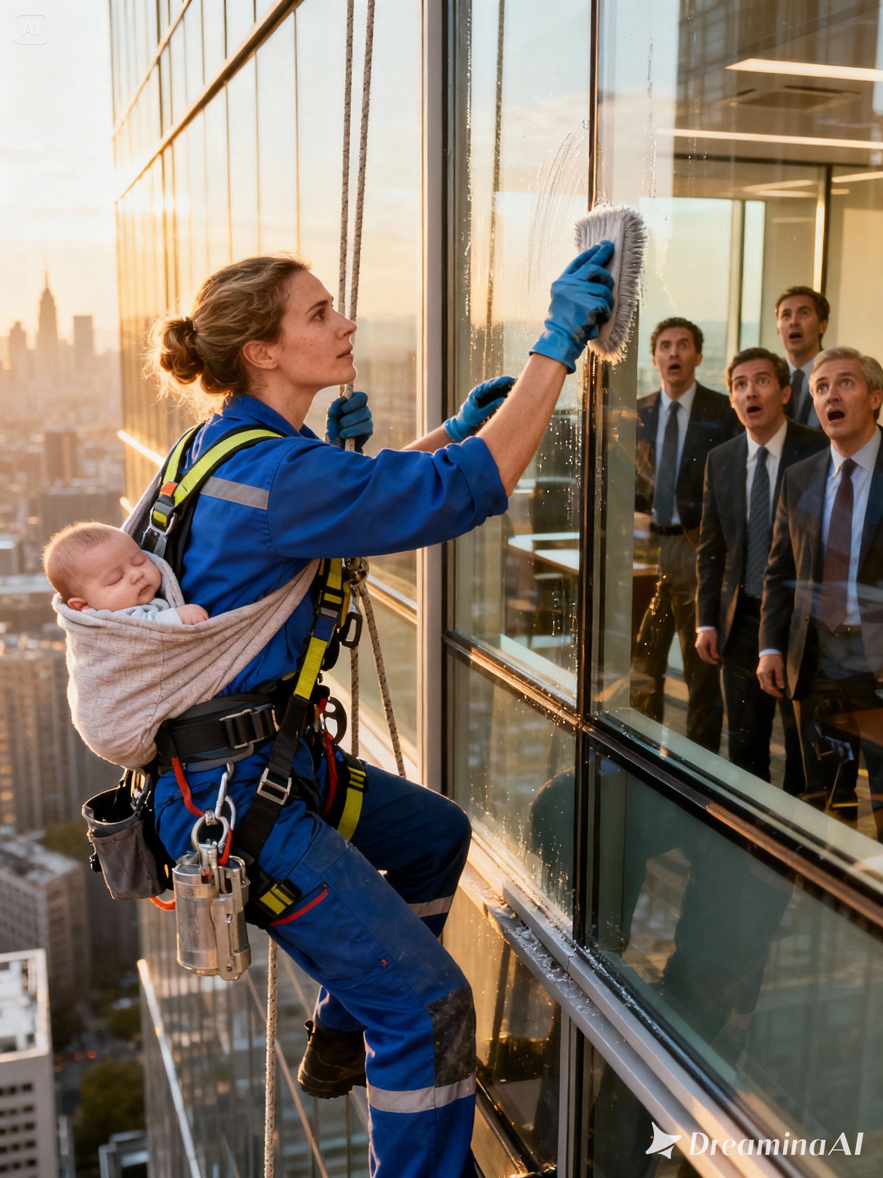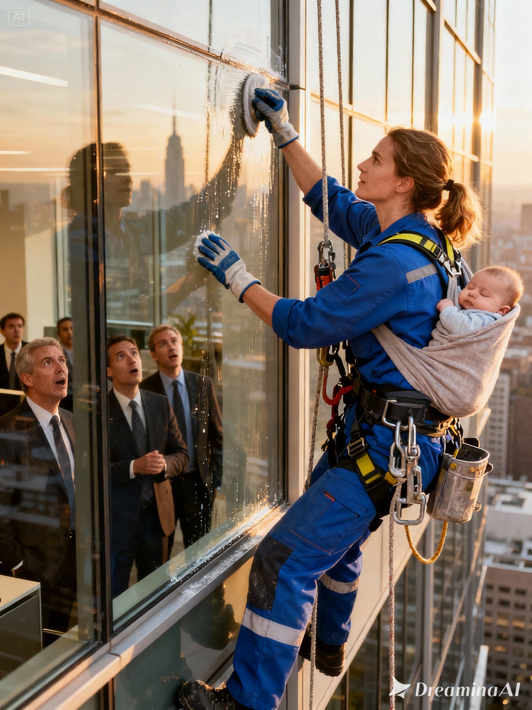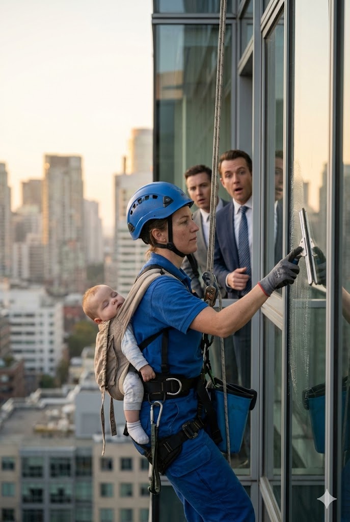 Then: a flash of sun, a moving silhouette. Suspended, small, impossibly brave. And a baby. Mateo. A child cleaning windows at that height.