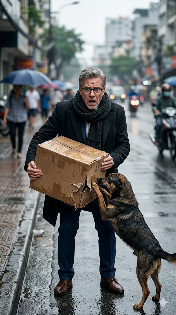 It didn’t stop for a moment. Pressed against a square cardboard box set next to a metal bin at the edge of the sidewalk, the dog tugged at the softened corners with its teeth, pounded the sides with its paws, circled around anxiously, then returned to the attack, as if every ounce of its being was focused on a single urgent mission: to open it.