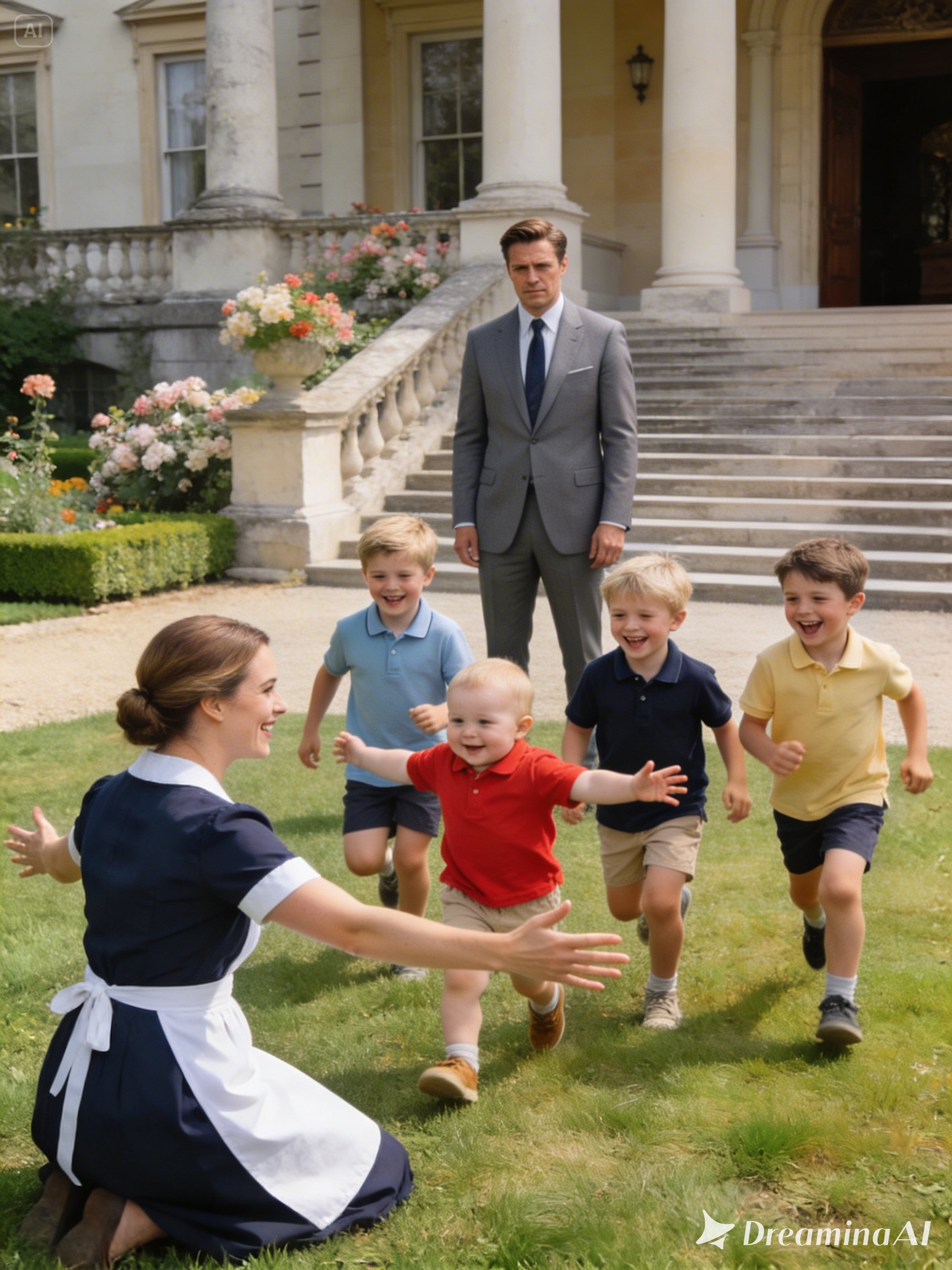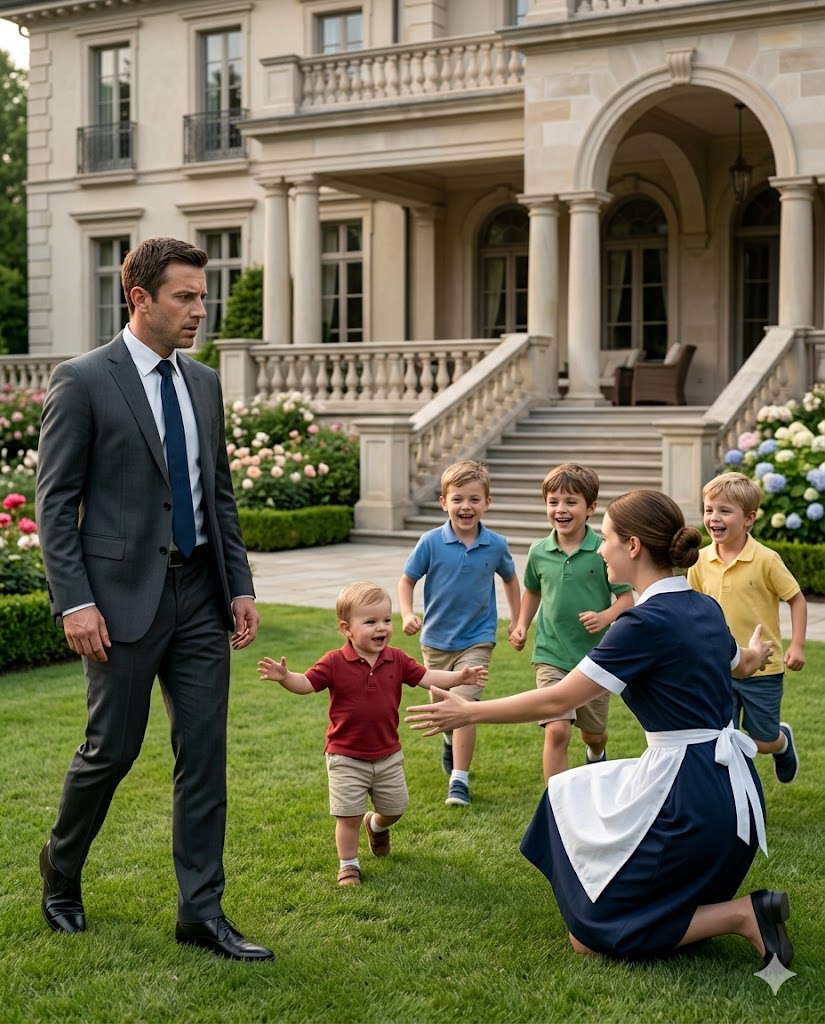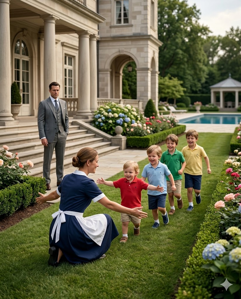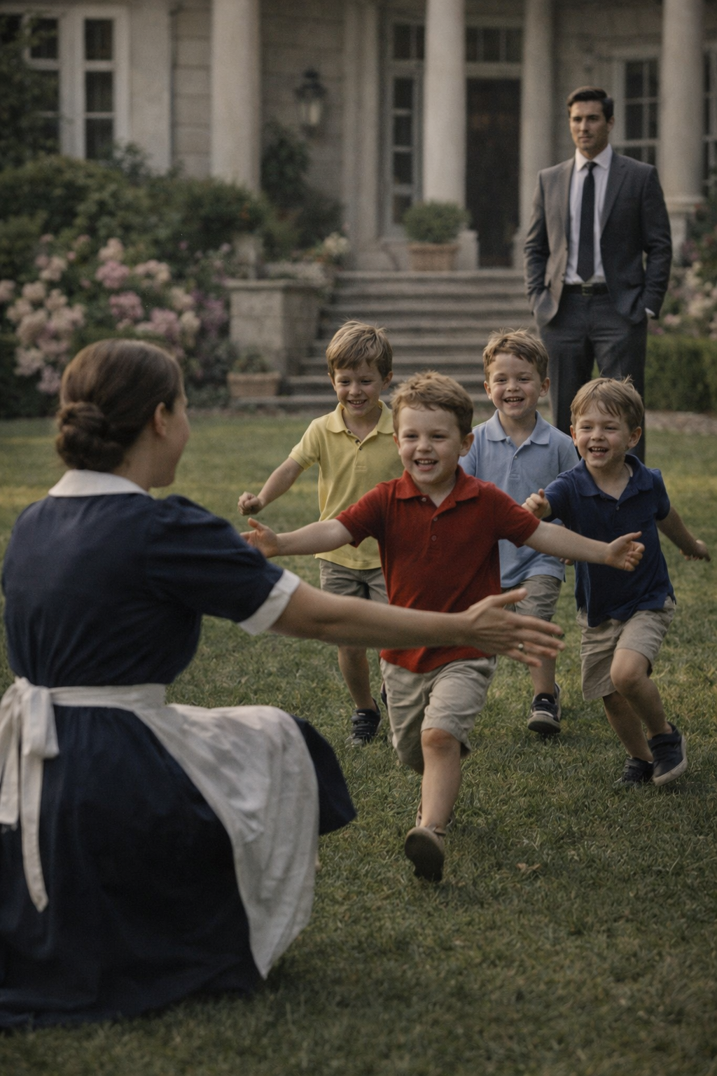 A few meters away, in the vast garden, his four sons—Mateo, Emiliano, Diego, and Santiago, all six years old—played and laughed. Their giggles were rare in the cold mansion. Tiny sneakers crunched the manicured grass as they fled from the expensive nanny Alejandro had hired.