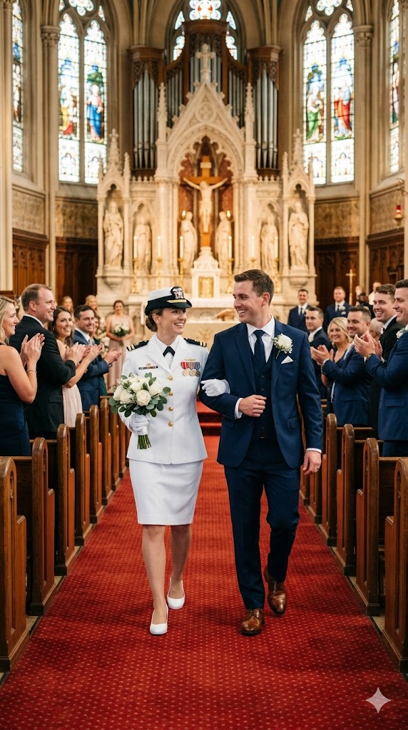 The silence that swept across the church atrium was immediate. Guests who had been chatting or smoking outside suddenly froze. They didn’t see tulle or lace. They saw a pristine white dress uniform, flawless and radiant beneath the morning sunlight. They saw the two stars on my epaulettes. They saw rows of medals that chimed softly with each step.