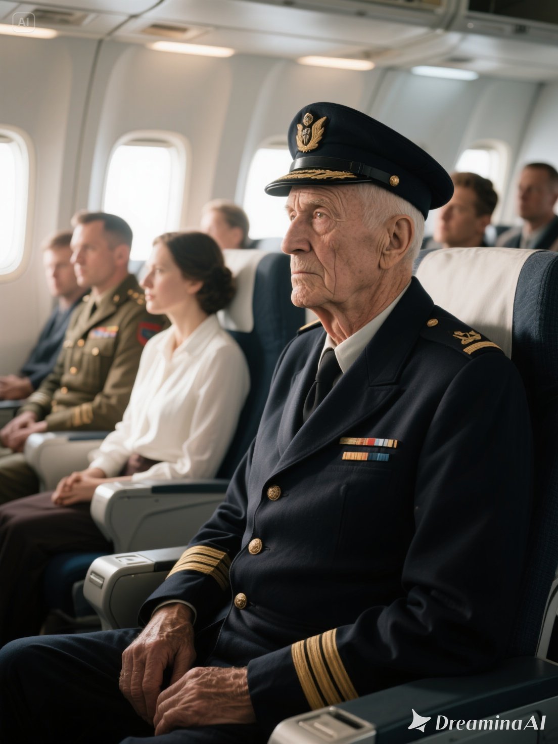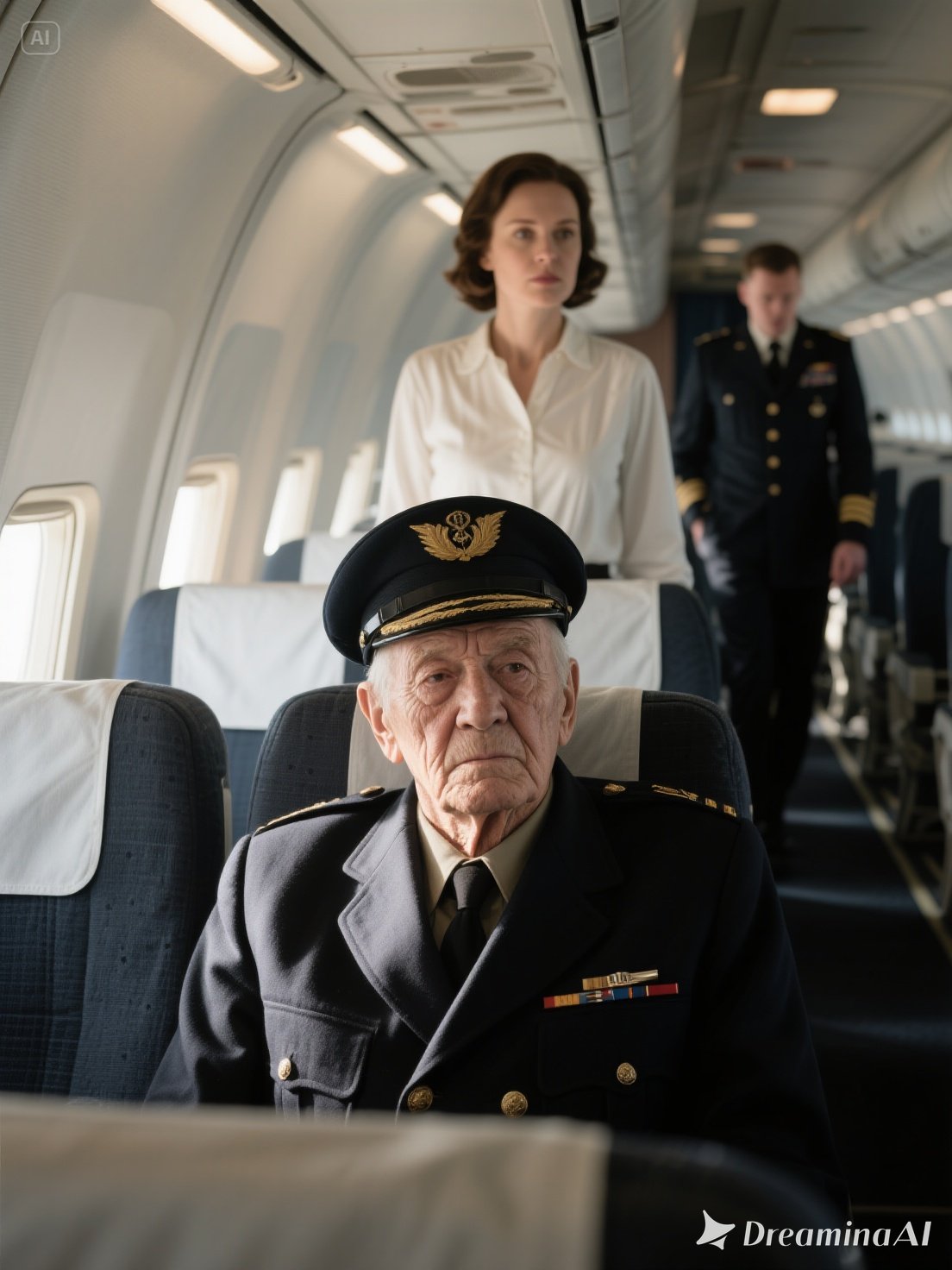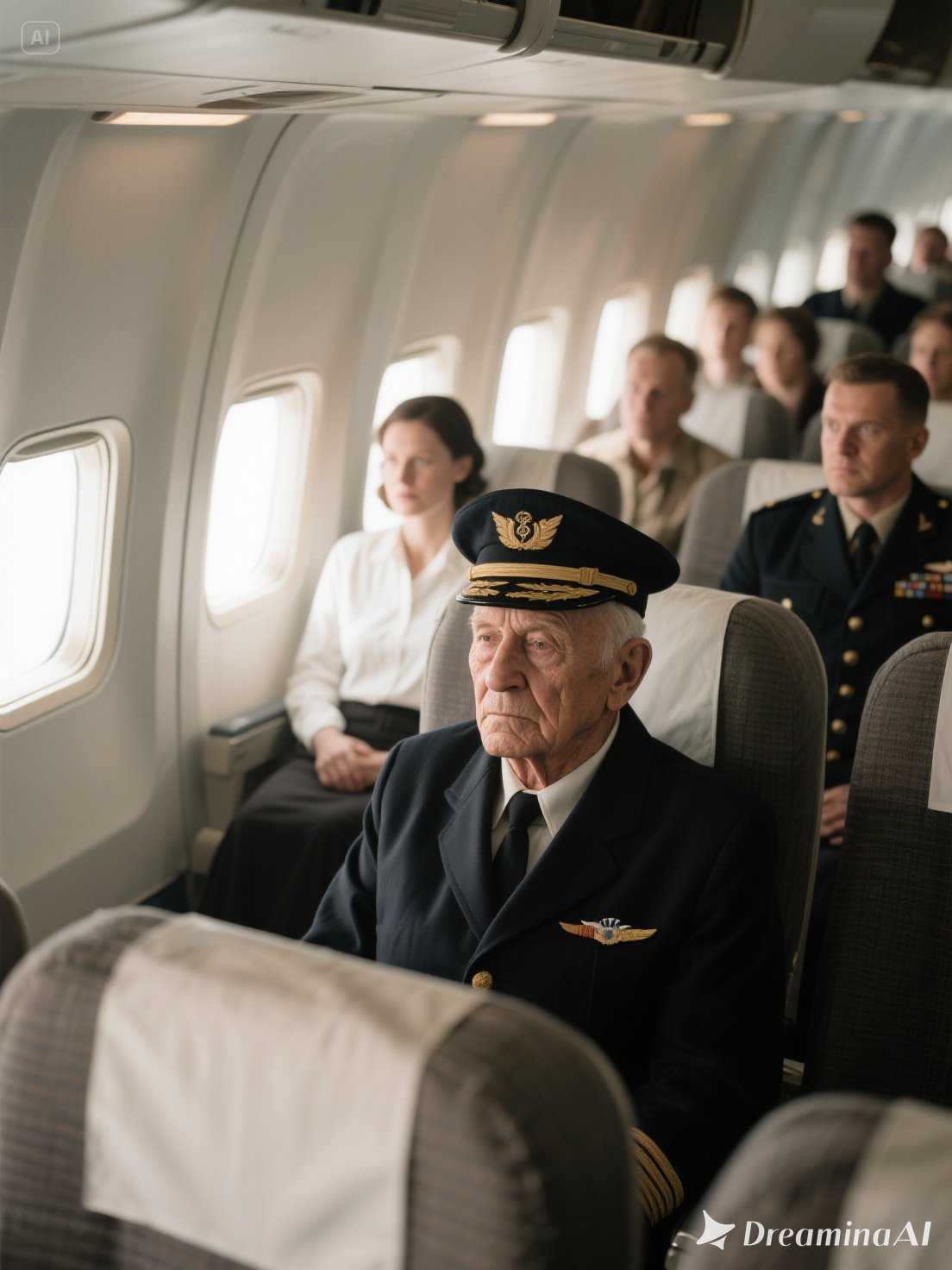 As the plane climbed, sunlight caught the sliver of silver at Frank’s lapel, scattering light across cloth and sky.