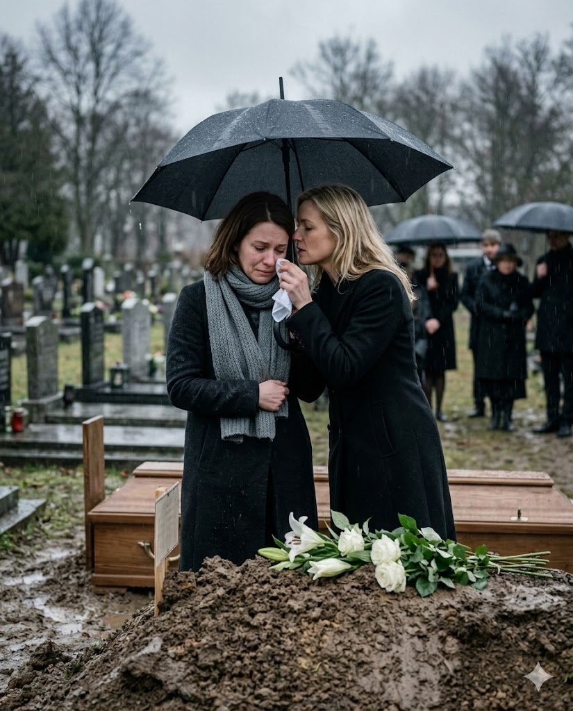 I stood beneath a black umbrella, my fingers numb, listening to the dull thud of dirt striking polished wood. The wind swept through the cemetery, tugging at the ends of my borrowed scarf. Beside me, my half-sister Victoria dabbed at eyes that weren’t even wet with a lace handkerchief.