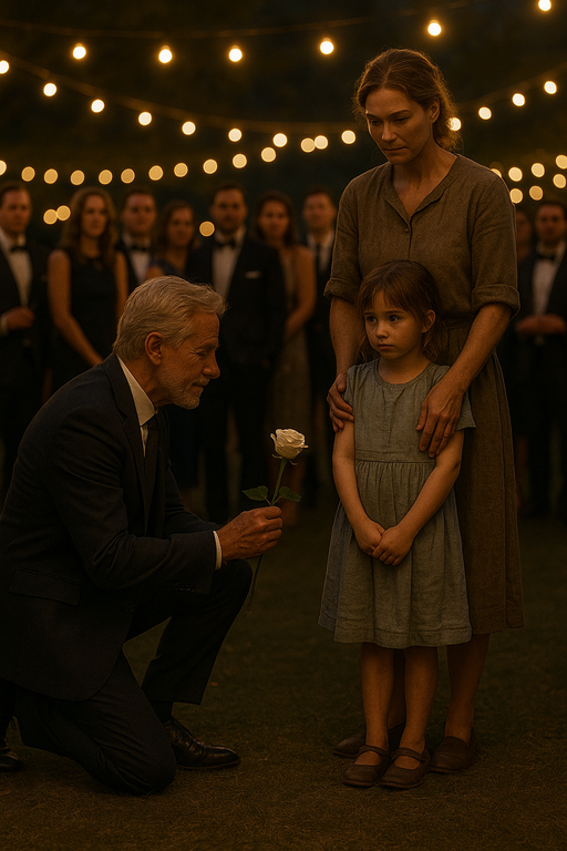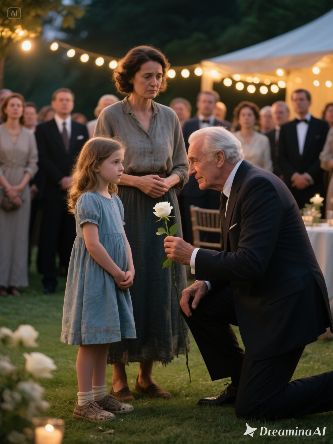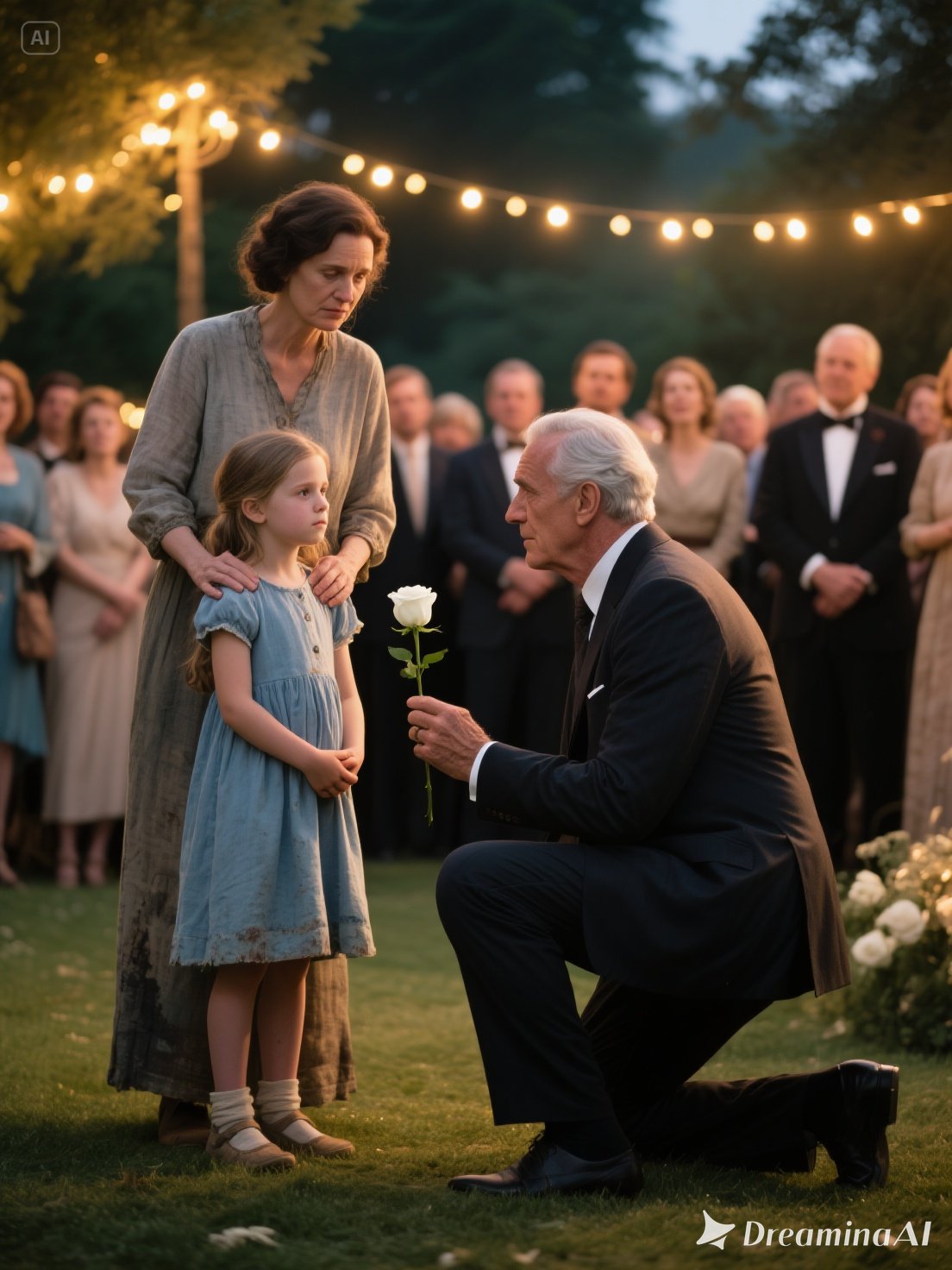 The girl blinked, unsure if it was a mistake. The man knelt slightly, holding out the rose.