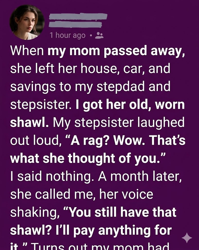 That night, I spread the shawl across my bed. It smelled faintly of my mom—lavender and something softer, warmer. I pressed it to my face and cried—not because of the inheritance, but because I couldn’t ask her why.