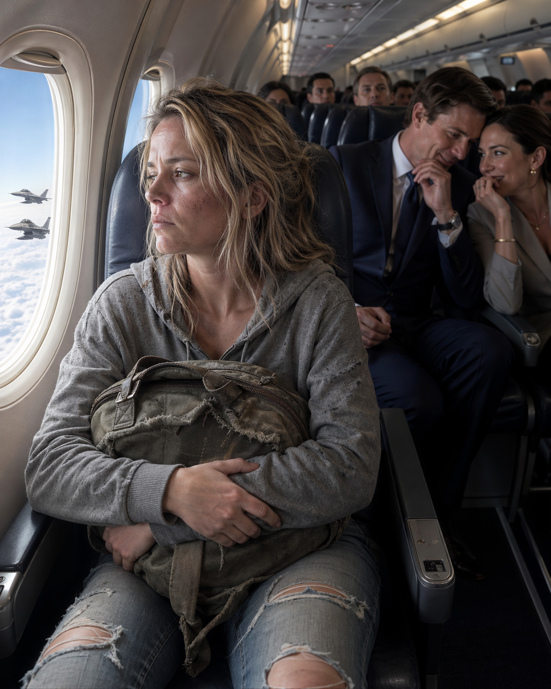 Seat 22C was by the window. A woman in a worn gray hoodie slept against the glass, her head tilted, one arm wrapped around a canvas tote that looked like it had lived a long life. Her dark hair was tied back in a loose ponytail. No makeup. No jewelry except a thin chain at her neck. Scuffed sneakers. Faded jeans. Sleeves worn pale at the elbows.
