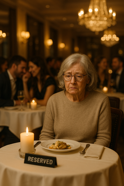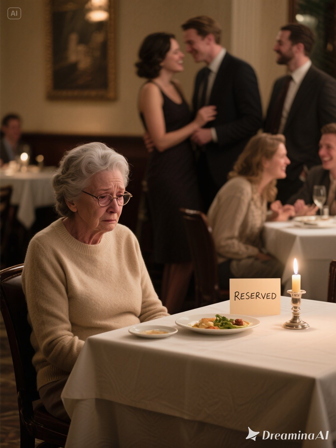 Eliza stepped in wearing a faded wool sweater, a long gray skirt, and comfortable orthopedic shoes. Her silver hair was neatly pinned, her eyes alert behind thin wire-rimmed glasses. She stood quietly at the entrance—unnoticed—until the maître d’ turned around.