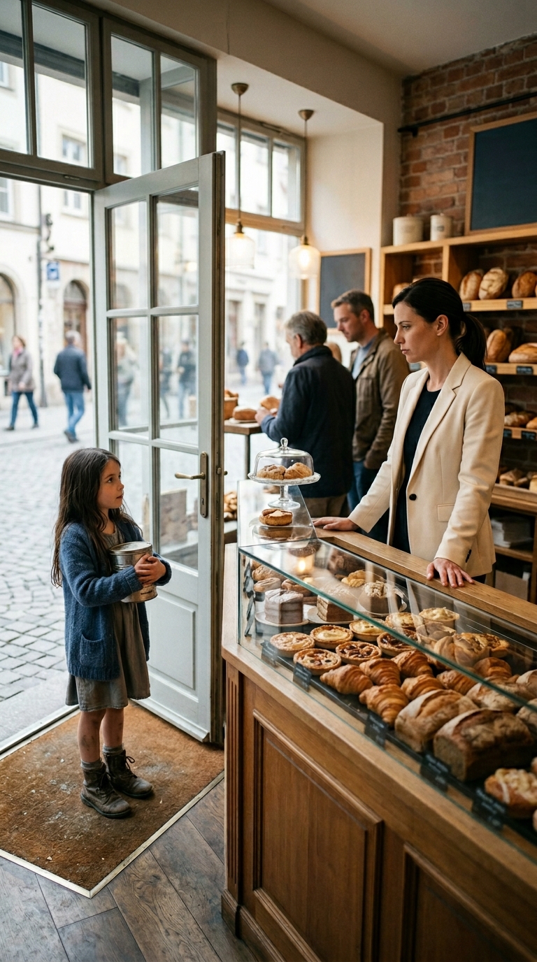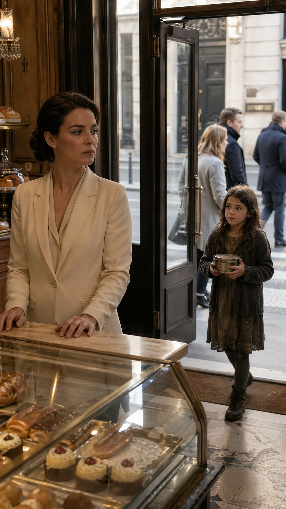 Inside, the bakery was warm and glowing. Golden pastries filled the display cases. Well-dressed customers lined up at the counter while the wealthy owner moved through the room with quiet control, as if everything was exactly where it belonged.