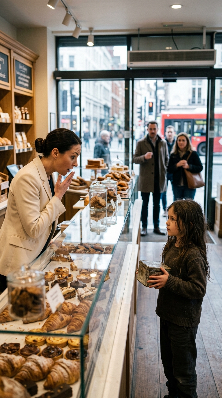 The small girl stood outside the bakery, trembling in the cold, clutching a tiny cookie tin tightly against her chest—and a single look inside it would change everything the owner thought she knew.