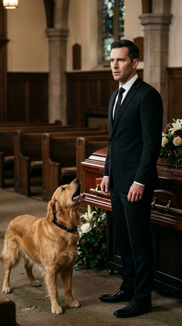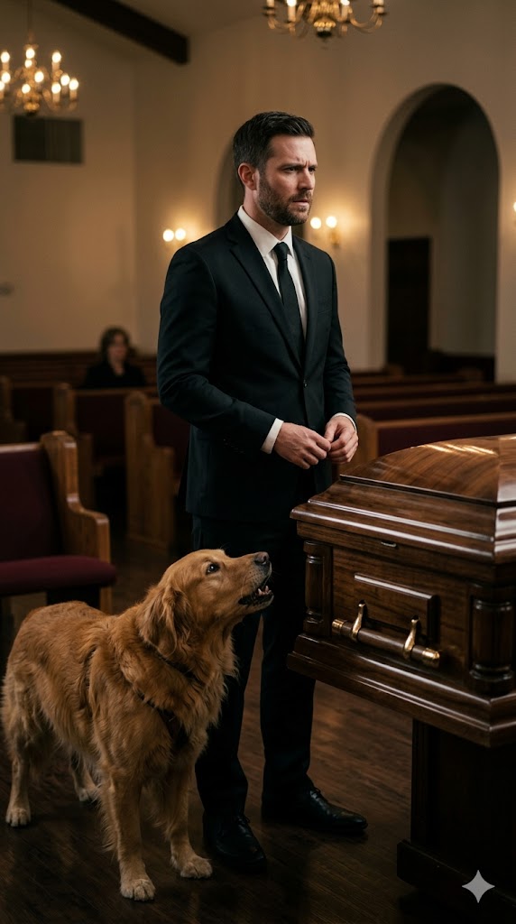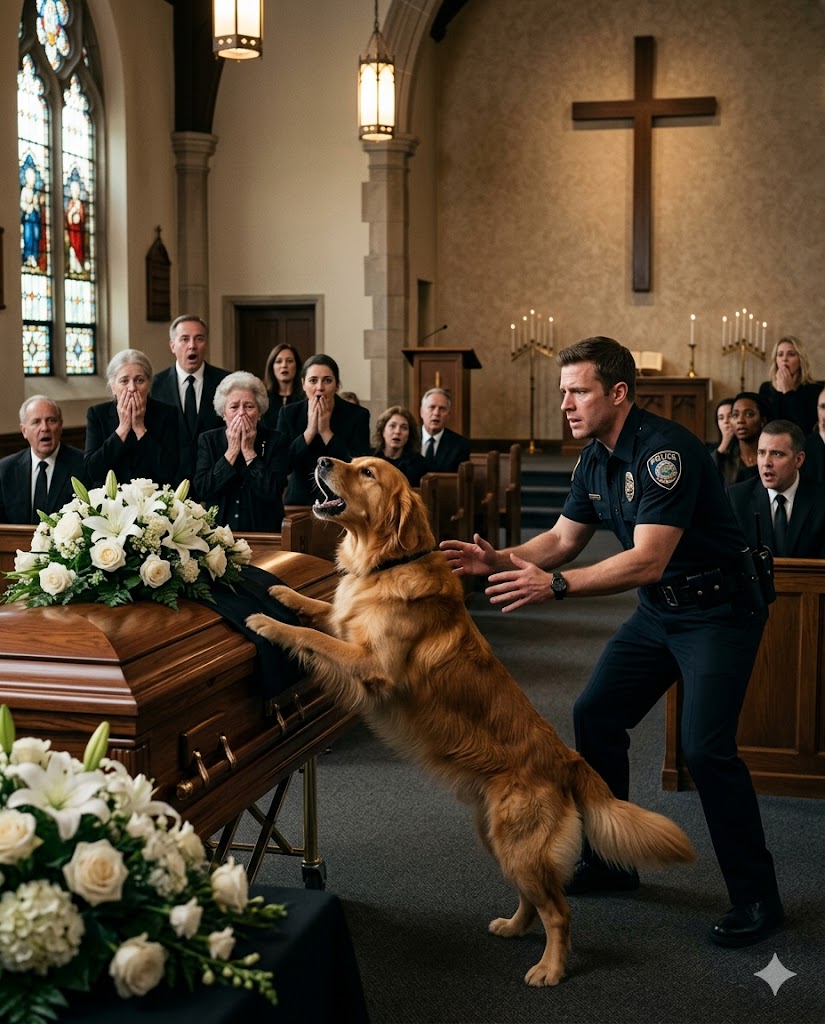 His barking ripped through the chapel like gunshots, breaking the thick stillness grief had settled over the room. The golden retriever lunged at the polished oak coffin, his lean body slamming into it hard enough to make it shift. People gasped and stepped back.