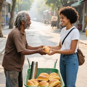 Before warmth could settle, hurried footsteps cut across the street. The stranger who had shouted earlier pushed through the dust. Slim, in a dirty shirt, eyes wild, he shouted, “That bag is mine! I saw it first. I was coming to bid, but these boys stole it!”