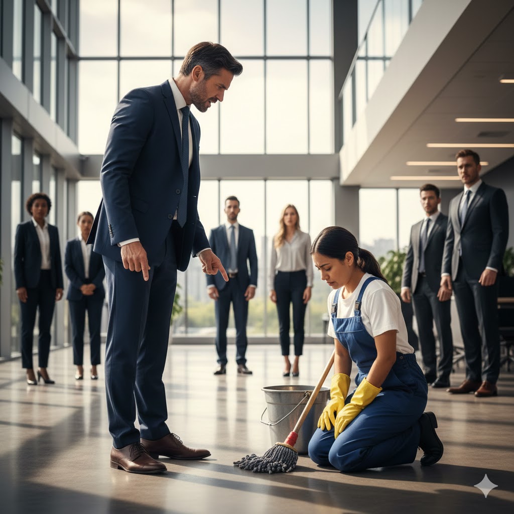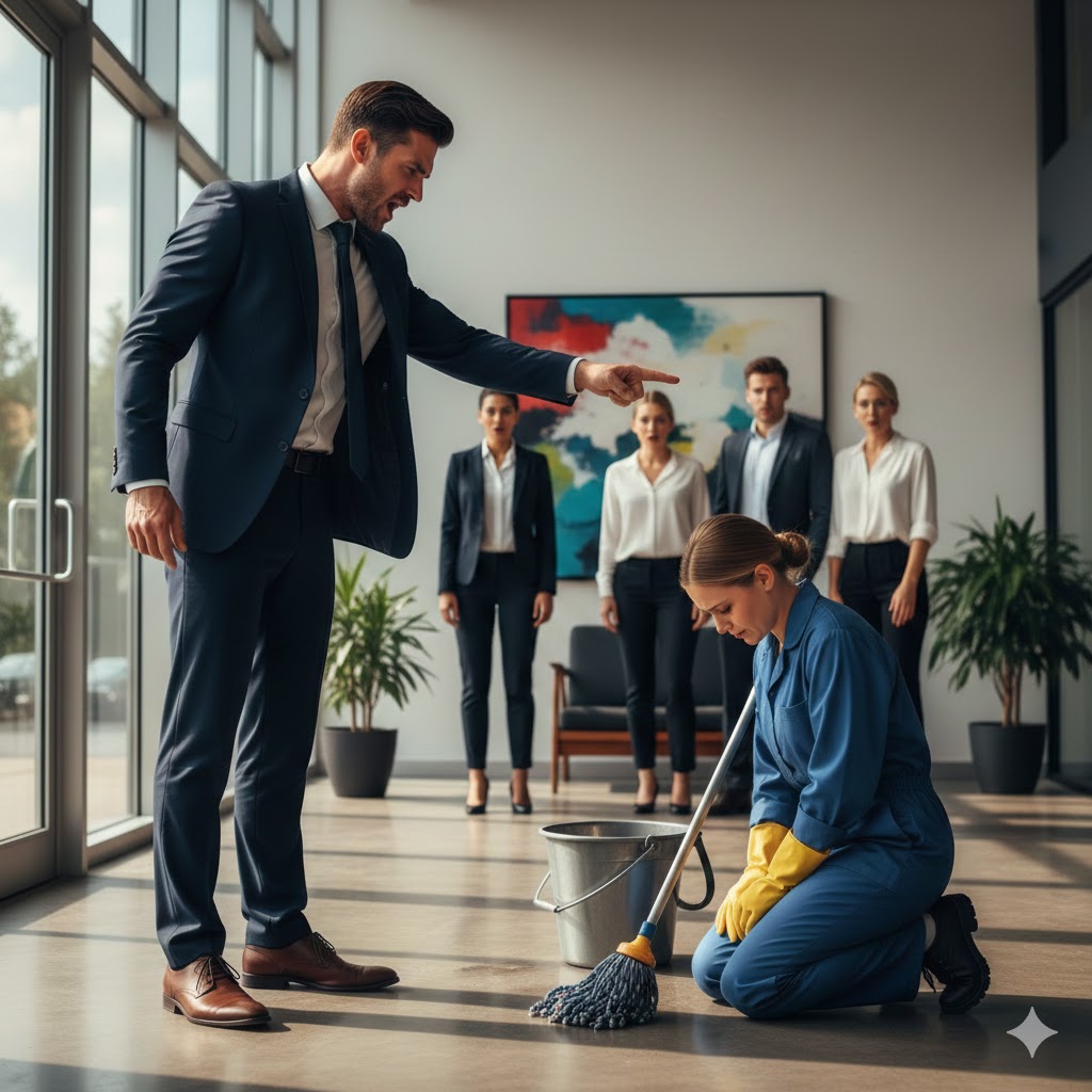 Judith knelt silently, a mop gripped in her hands. Her blue janitor’s uniform clung to her arms from the strain. A stained white apron was tied at her waist, and her yellow gloves were soaked through. Beside her, the mop bucket gave a soft rattle as she scrubbed at a stubborn mark on the floor. She had worked here for barely a week.