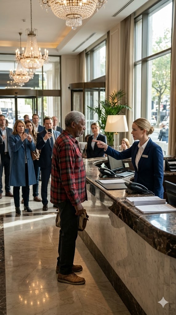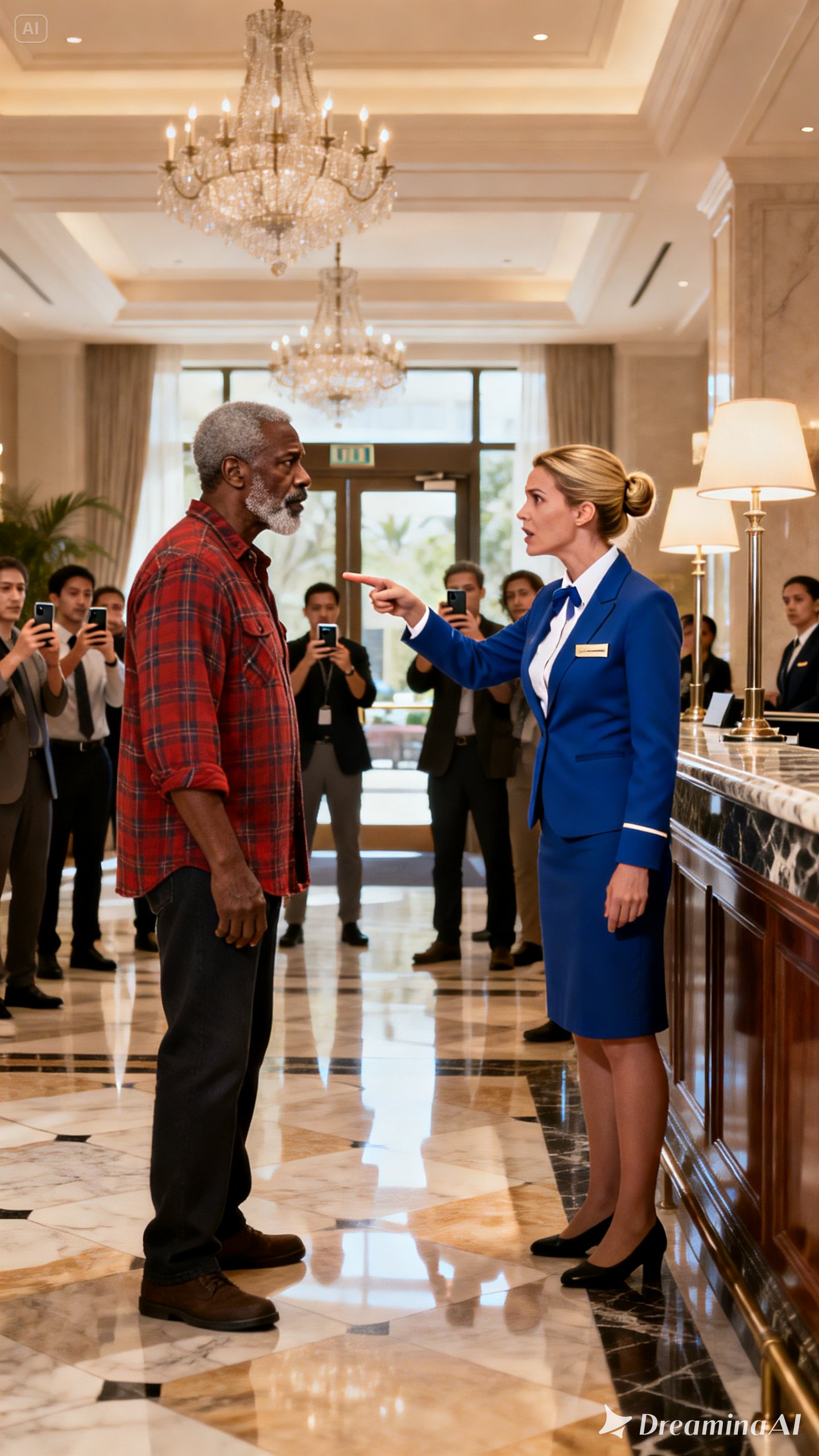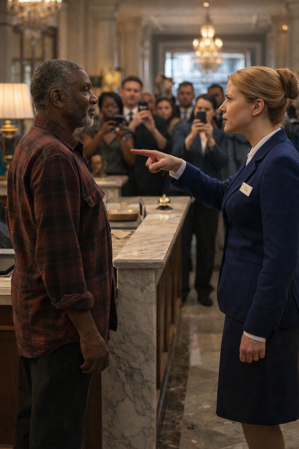 Jackson entered the marble-bright lobby, dust clinging to his battered shoes, his plain shirt wrinkled from a sleepless overnight flight. The chandeliers overhead glowed warmly, yet the atmosphere instantly chilled when he approached the front desk. The manager, Clara, looked him over once—from head to toe—then slipped a hand beneath the counter and quietly pressed a button. Two security guards in uniform appeared at the far end of the hallway. She didn’t raise her voice. She didn’t have to. Her eyes delivered the message clearly. You don’t belong here. Jackson remained motionless, his hands resting calmly at his sides. In twenty minutes, she would be gone, her position stripped away, her reputation destroyed before the same people silently observing her now. But no one knew that yet. Not the guests sipping wine in designer jackets. Not the employees who deliberately looked away. Not Clara, who allowed herself a faint smile as the guards approached, because in their minds, Jackson was simply another man who didn’t fit in. In his mind, however, this was a test they were all about to fail.
