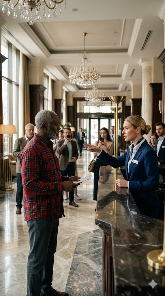 “I’m asking you one last time to check the system,” Jackson said calmly. Clara offered no reply. She pressed a button beneath the counter and spoke sharply into the radio. “This guest is creating a disturbance. Please escort him out.” The receptionist, Ryan, froze in place, his fingers suspended above the keyboard. In the distance, footsteps drew closer. Jackson’s card still rested on the counter, untouched.