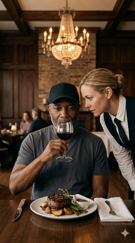 The steakhouse sat in a worn strip mall between a liquor store and a check-cashing place, nothing remarkable—just somewhere people stopped for lunch, then moved on and forgot. But Daniel Whitmore wasn’t just passing through. He stepped inside in worn denim, boots that had seen more years than polish, a faded cap pulled low, and a brown leather jacket marked by miles.