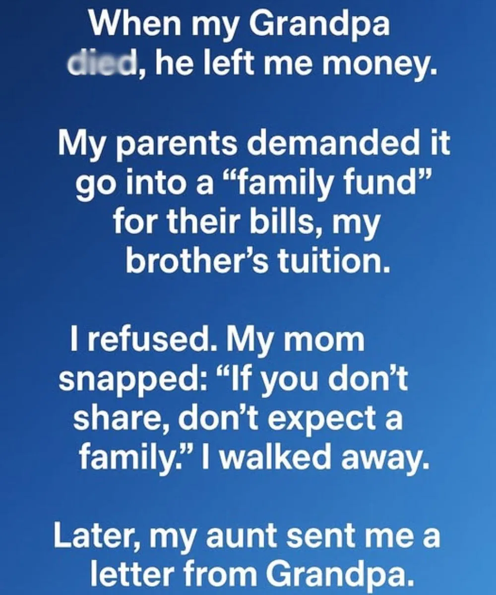 Reading his letter helped me understand why the argument felt so heavy. My parents weren’t trying to harm me. They were overwhelmed, stretched thin, and doing what they believed was best for the household. They saw the inheritance as a solution. But my grandfather saw it as a chance—not for the family, but for me. And if I handed it over, I would be repeating the same familiar pattern: giving up my needs to solve problems that weren’t mine to carry.
