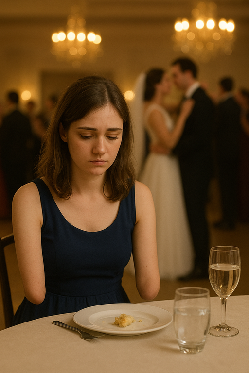 Unwanted and cast aside by her adoptive family, Sofia Rosso stood at the edge of the glittering hall, her single arm clutching the invitation like a lifeline. Laughter, jazz, and the clinking of champagne glasses filled the air, but only one waiter quietly motioned her toward an isolated table tucked beneath a drooping palm — a lonely corner reserved just for her.