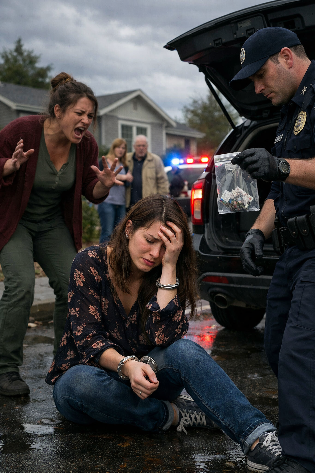 I heard myself say, “That isn’t mine,” but even the words sounded fragile. One officer read me my rights while the other closed the trunk. Neighbors peeked from behind curtains as I was handcuffed and placed in the back of a patrol car.