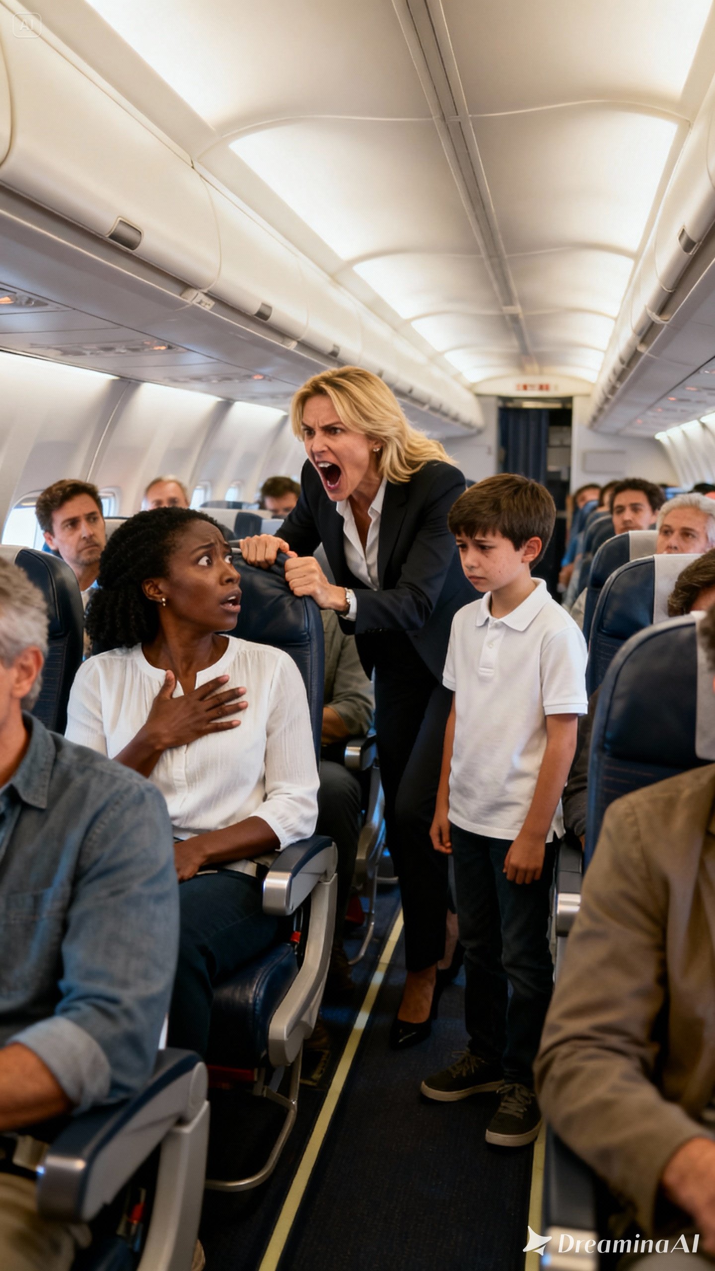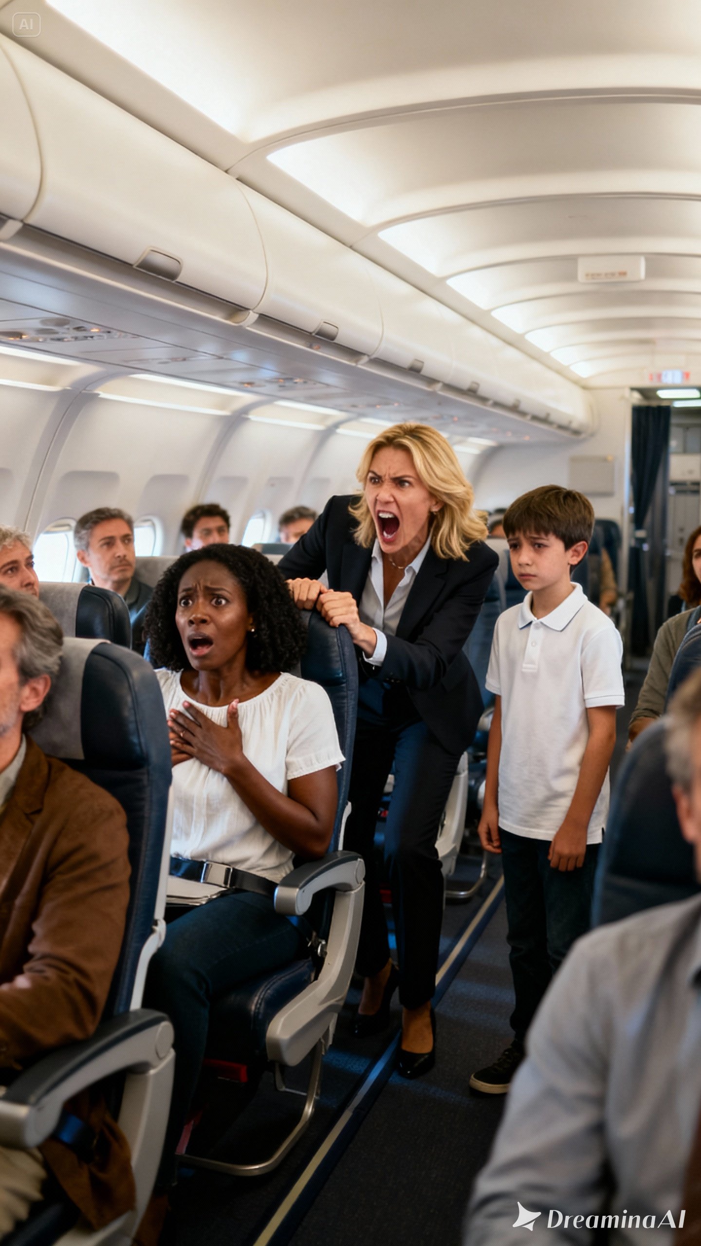 The blonde woman wasted no time. “Yes, Captain! This passenger refuses to give up her seat so I can sit next to my child. She’s being completely unreasonable!”