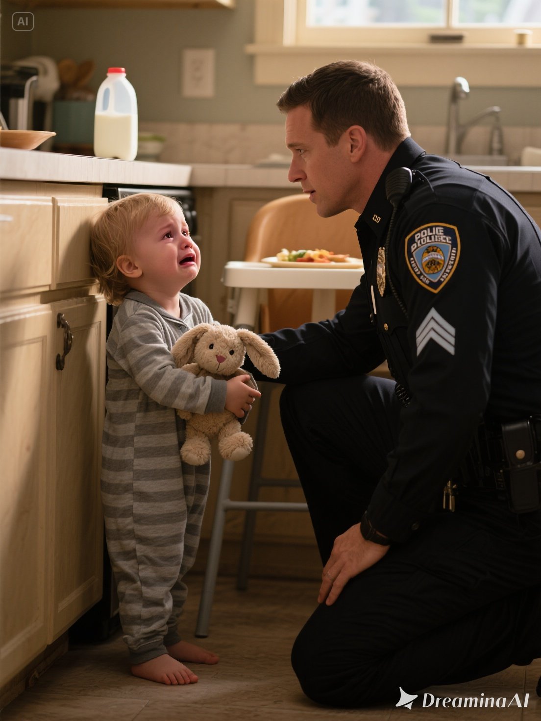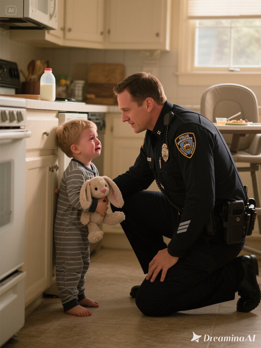 A police officer crouched down and asked softly,