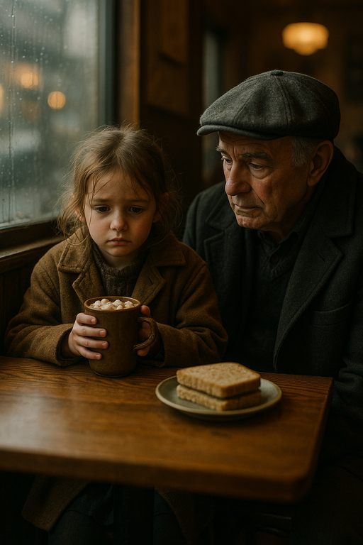 A little girl, no older than eight, stood alone at the edge of the sidewalk, nose nearly pressed to a bakery window. Her coat was torn. Her shoes soaked through. Her wide brown eyes—eyes that should have shone with joy—stared silently at the tray of pastries inside.