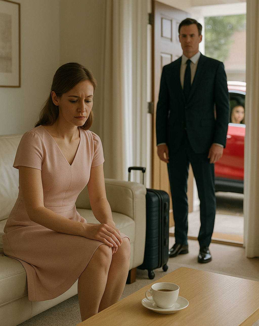 The living room was too quiet, though the clock on the wall ticked loudly enough to remind Laura of every passing second. She sat rigidly on the edge of the cream leather sofa, her fingers tracing the rim of her untouched teacup as though the porcelain could anchor her trembling heart.