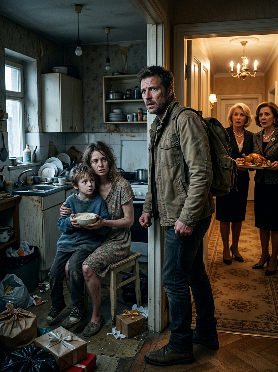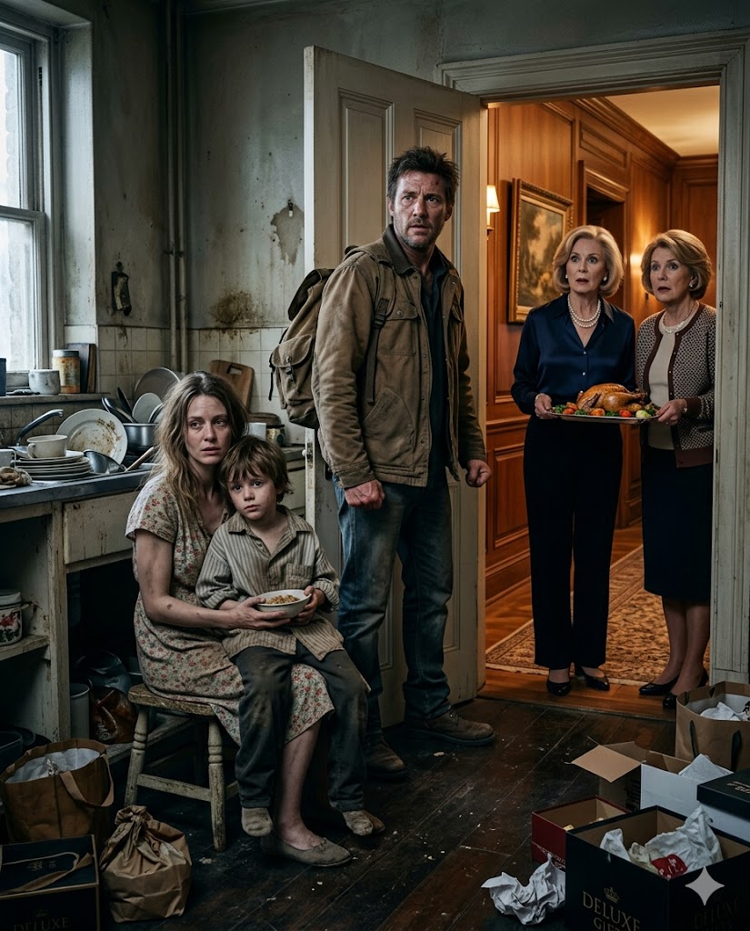 Your mother steps into the doorway behind her, still wearing pearls, still carrying that polished hostess posture she must have perfected over five years of spending your money like it came from nowhere instead of your sacrifice. For a full second, nobody speaks. Then Leo looks up from the cracked plastic plate in his lap, sees you in the doorway, and goes completely still.