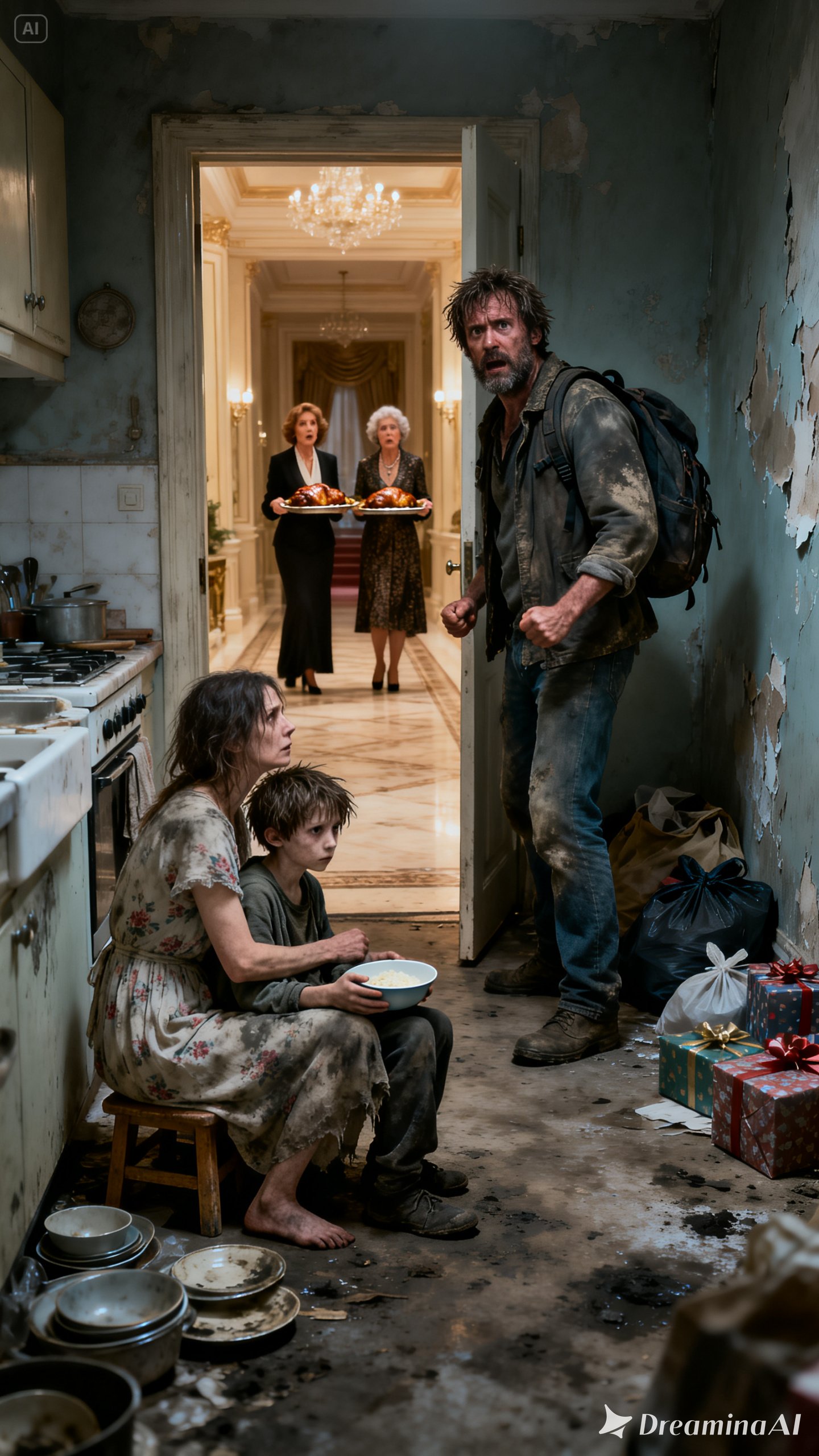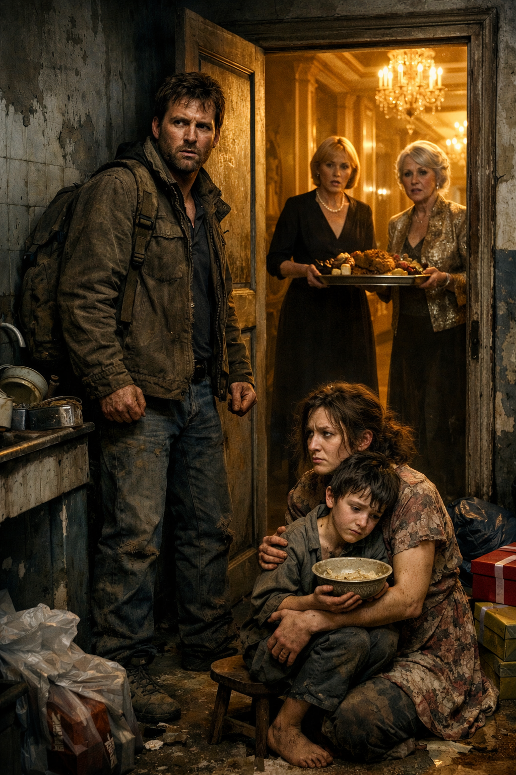 You hear laughter from the dining room. Glasses clinking. Music too soft to hide anything. The smell of expensive food drifts back here, into the place where your wife has been washing spoiled rice so your son can eat something. The contrast is so wrong it feels unreal.