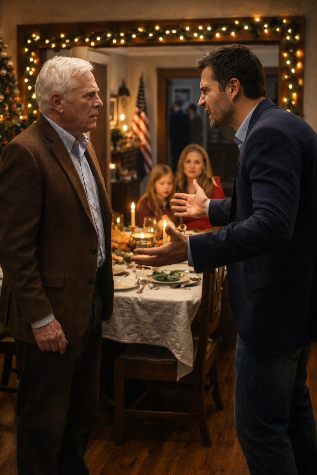 The heavy oak door swung open, and the cold December air rushed inside—sharp, clean, shocking. Forty degrees, maybe colder. The dark rectangle outside widened, swallowing the warm yellow glow of the house.
