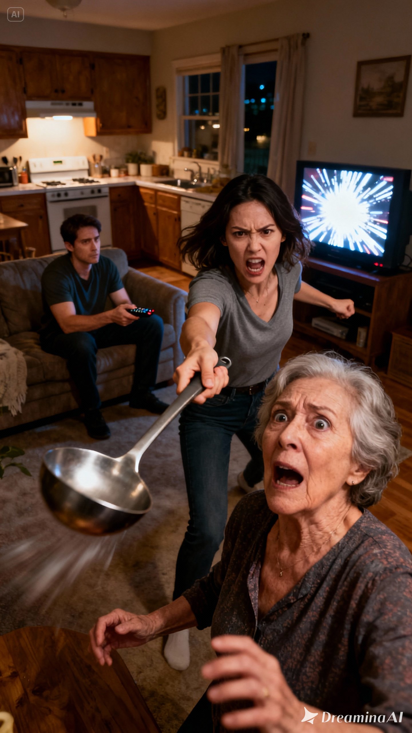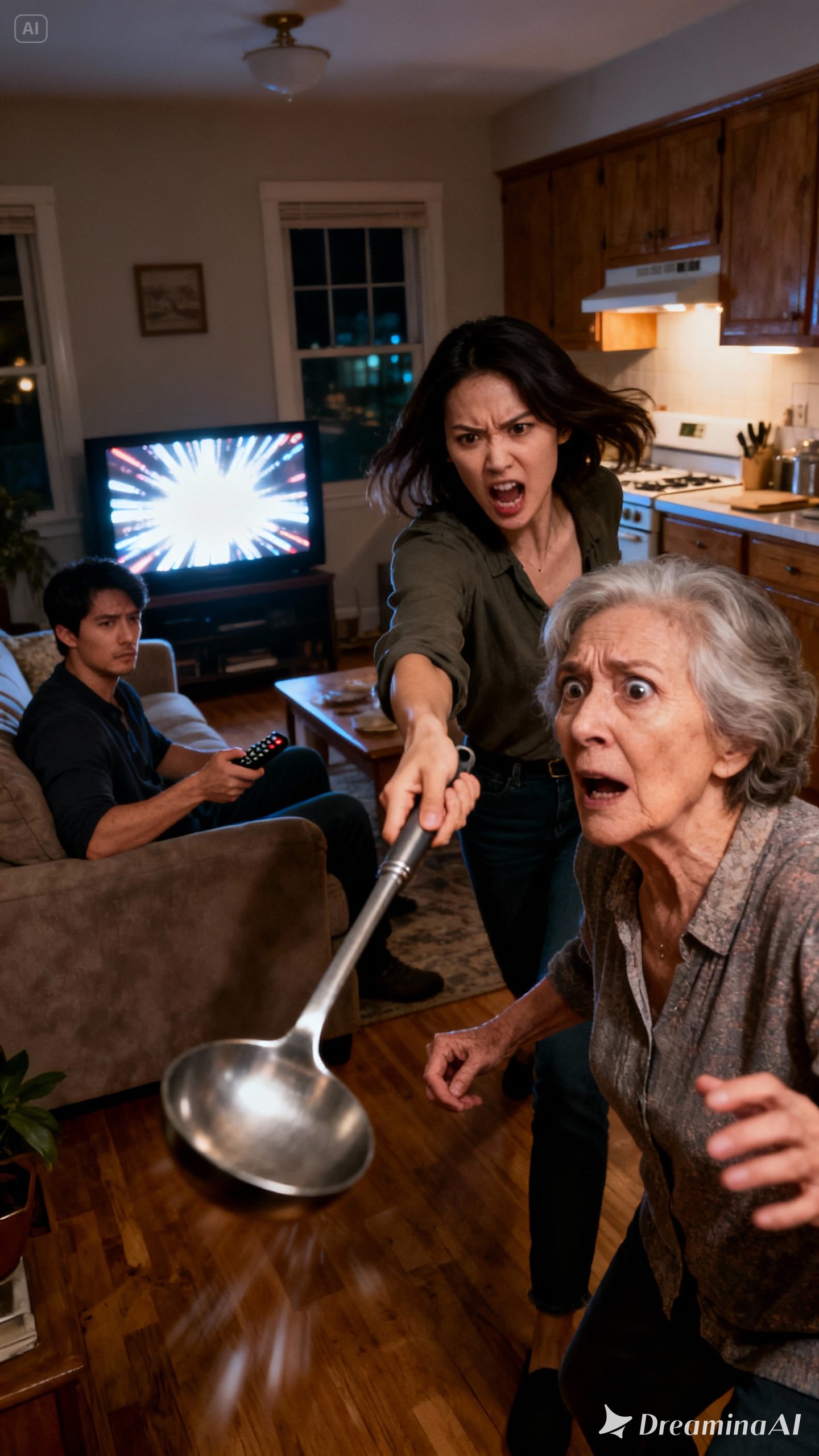 I stood there, the ladle dripping at my feet, my head throbbing. I looked at Robert, illuminated by the TV’s blue glow. He saw. He heard. He chose the sitcom.