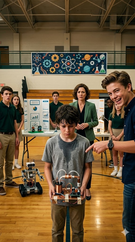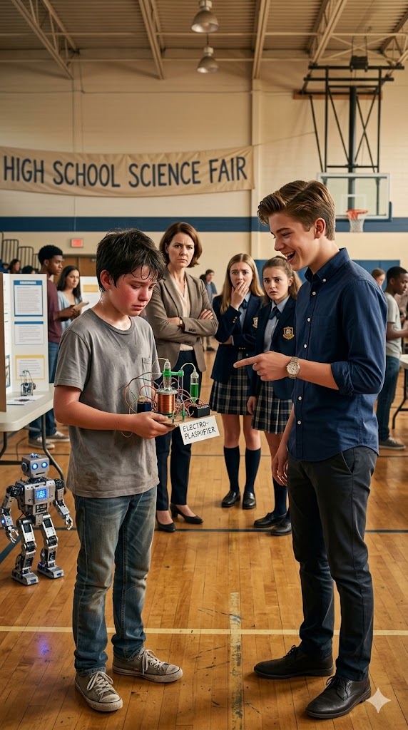The sun had barely slipped through the cracks of the tin roof when Álvaro woke up. It wasn’t an ordinary morning; his stomach twisted as if he had swallowed stones. He was twelve years old, with rough, calloused hands and a science project that, at first glance, looked like nothing more than a pile of junk rescued from a landfill. While most kids his age dreamed about the newest video games, Álvaro dreamed about pipes, water pressure, and physics. His “room” was just a corner behind an old curtain inside the workshop of his grandfather Nicolás—a seventy-eight-year-old man whose shaking hands carried the knowledge of fifty years spent working the land.