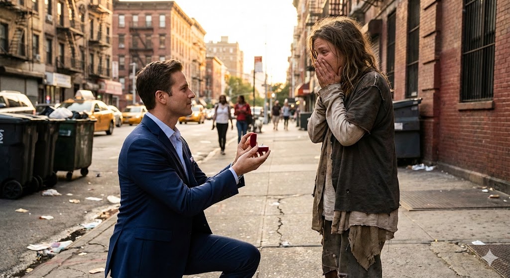 Without waiting for an answer, the stranger dropped to one knee right there, amid tourists and street vendors. He produced a small red box and opened it. A ring caught the dying sunlight, flashing like a cruel joke.
